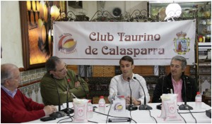 CALASPARRA (Murcia). Miércoles, 4 Marzo 2015. Remitido.- Prensa-C.T.C. En la noche de ayer tuvo lugar nuestra habitual tertulia mensual con el novillero con caballos murciano José Manuel –antes “El Suresteño”- y su apoderado el matador de toros retirado y empresario Luis Sánchez Pacheco “Guerrita” como protagonistas. Nuestro presidente Francisco García presentó el acto que fue moderado por Juan Vicente Rubio.