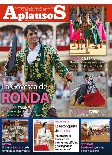 Uno de los acontecimientos taurinos más importantes de la temporada, la corrida Goyesca de Ronda, es uno de los atractivos esta semana de la revista Aplausos. Acontecimiento donde uno de sus actuantes, Enrique Ponce cumplía su corrida número 2.000 y de cuya efeméride el semanario se ha hecho eco a través de una entrevista con el protagonista. Asimismo, junto al torero de Chiva, la sección de entrevistas está dedicada esta semana a Manuel Jesús «El Cid» y a Víctor Puerto. El de Salteras, que vuelve a encontrarse en un momento dulce, declara: «Gracias a la afición, a no cansarme y a no tirar la toalla en momentos difíciles, he podido tirar para adelante», y añade: «En Madrid saqué el amor propio. Fue la tarde más importante del año porque me dio mucha moral y confianza». Por su parte, Víctor Puerto, tras su regreso a los ruedos, afirma: «Sé que soy capaz de pasar por la vereda que me dejen y llegar a donde huelen las flores». Otro nombre propio del presente número es el del novillero sin caballos Antonio David, que debutará con los del castoreño este jueves días 9 en Sonseca, y sobre los novilleros, precisamente, se realiza un completo reportaje en el mes de las novilladas por excelencia. Además, y como es habitual, se cuenta con las firmas de opinión de José Luis Benlloch, Manolo Molés, Carlos Ruiz Villasuso, Barquero y Paco Mora, mientras que en cuanto a actualidad, se da precisa información de los festejos celebrados en Palencia, Mérida, Santoña, Calasparra, Aranjuez, Albacete, Valladolid, Bayona, Sevilla, Linares, Lisboa, Colmenar Viejo o Madrid, entre otros.