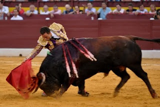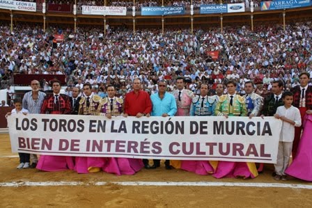 Dia festivo en Murcia. Tras el paseillo toreros y representaciones de los aficionados portaron la pancarta »Los Toros en la Región de Murcia »Bien de Interés Cultural». La plaza registró la mejor entrada en lo que va de feria, casi tres cuartos de plaza, aunque podría haber sido mejor, la corrida de hoy merecía especialmente la pena no perdersela, una de las más interesantes de esta feria y con los toros de Fuente Ymbro, que no defraudaron. Los de Ricardo Gallardo, bien presentados, de interesante juego desigual, flojo el 1º, destacaron 3º y 4º, a este se le dió la vuelta al ruedo. El que cerró plaza un manso que sacó genio y tuvo sus complicaciones.