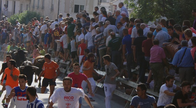 CALASPARRA (Murcia). Jueves, 3 Septiembre 2015. Redacción.- Foto.- Encierro de hoy. – Primer Encierro- Mucho ambiente en Calasparra. Tras el preceptivo cohete, a las 10 en punto de la mañana han salido de los corrales los espléndidos novillos-toros de El Cubo, cinco negros y un castaño, que se lidiarán esta tarde. Ha sido un encierro rápido y limpio, tan solo dos minutos desde la salida -Plaza Constitución hasta los corrales de La Caverina, encierro cómodo por los pocos corredores, con mayor número en el tramo final, que han acompañado a los novillos que han hecho el recorrido agrupados, excepto uno que ha ido unos metros descolgado. El tiempo total del encierro, desde la salida de los corrales en la Plaza de la Constitución hasta los corrales de la Plaza de Toros, ha sido de cuatro minutos. La no masificación de corredores esta mañana tiene de favorable que no se vean incrementados los riesgos. Tan sólo dos incidentes, afortunadamente sin consecuencias, el primero un mozo que cayó delante de la manada en la calle Ordóñez que le pasó por encima y le perdonó. El segundo susto ha sido en la entrada de la Plaza, afortunadamente, también, sin consecuencias.ESTA TARDE: 1ª de FERIA DEL ARROZ 2015Novillos-Toros de El Cubo para:DAVID FERNÁNDEZ (Cehegín) – DIEGO CARRETERO (Hellín) – Javier Moreno «LAGARTIJO»