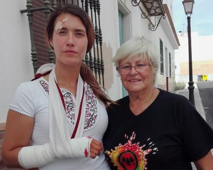 La novillera Conchi Ríos, en foto de hoy junto a Angela, su apoderada, ha sufrido esta mañana un percance en el campo. La murciana fue volteada cuando toreaba una vaca en la ganadería de Núñez Pallarés y ha sufrido un fuerte golpe en el brazo derecho y erosiones en la frente.El alcance de la lesión se confirmará este sábado, cuando se le realicen distintas pruebas radiológicas.
