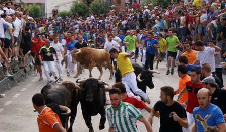 CALASPARRA (Murcia). Sábado 5 Septiembre 2015. Redacción.-Foto de hoy.Hoy, muy pendientes del cielo por las predicciones de lluvias, y las calles de Calasparra abarrotadas, no sólo de calasparreños, sino, también de los muchos aficionados venidos del resto de España y de otros países, que son habituales en la Feria y Fiestas. De ahí el que se nombre a Calasparra como la «Pamplona del Sureste de España». A las 10 en punto de la mañana, tras el cohete, se han abierto los corrales de la Plaza de la Constitución. con una duración hasta la entrada en la Plaza de Toros de 2’36». Encierro este de los «cebadas» muy parecido al de ayer con la manada muy estirada, aunque un novillo quedó rezagado y se llegó a volver teniendo que emplearse los pastores. Los cabestros han sido los primeros en salir para rápidamente coger la cabeza un novillo colorado y uno negro. Muy estirado este encierro con galope templado y con picante, porque los novillos, carácter de este encaste, miraban y buscaban. Los momentos de mayor peligro y tensión los protagonizó un último novillo colorado que se volvía, derrotando en las tablas del entramado. Resolvieron los pastores con eficacia. Finalmente una mañana más un encierro limpio y sin percances que lamentar. Tras el encierro el ambiente y la fiesta continúa en la Plaza con la suelta de vaquillas y el incorporado, este año, concurso de recortadores. Y toda Calasparra, en el noroeste murciano, brilla con ambiente de Grandes Fiestas.