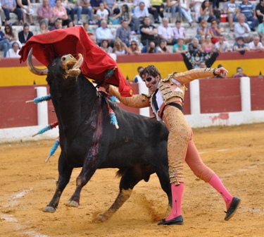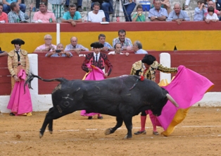 complicado. Brindó Antonio al empresario Juan Reverte. Puerta salió muy decidido y sabiendo la prenda que tenía delante. Le aguantó y le tragó lo indecible a un oponente que se había puesto imposible, y al que acabó pudiéndole y sometiendo en un pulso constante. Los mejores muletazos fueron por el pitón derecho sin dejarlo pensar. Por el izquierdo fue una tanda con tres muletazos potables. Y concluía la faena rayando en la temeridad, prácticamente encima y con los pitones tocándole la taleguilla, pisándole terrenos al novillo, y lo que se veía venir sucedió, en un derrote le echó mano de fea manera saliendo Puerta lanzado a gran altura. Tuvo suerte al salir ileso,