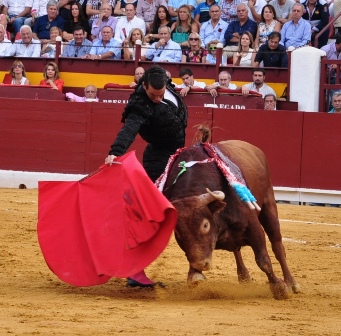 MANZANARES, en el segundo de la tarde que hizo cosas raras en el capote, como si estuviera reparado de la vista. Tampoco estaba sobrado de fuerza y claudicó varias veces, levantando la protesta del público. En el inicio de la faena perdió las manos un par de veces pero Manzanares lo templó bien y logró sacarle series buenas por el derecho, mucho más de lo que el