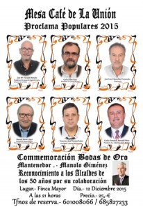 LA UNIÓN (Murcia). Martes, 8 Diciembre 2015. Informa.- Pepe Castillo Abreu. Como clausura de los actos del 50 Aniversario, la Asociación Cultural Mesa Café de La Unión celebrará gala acto de entrega de los «Populares 2015», que tendrá lugar el próximo sábado, 12 de diciembre, a las 21 horas, en el Restaurante Finca Mayor de La Unión, y que será presentada por el televisivo Manuel Jiménez. Además de los reconocimientos arriba citados,tendrá lugar un homenaje de reconocimiento a todos los Alcaldes que durante estos 50 años apoyaron la Mesa Café.