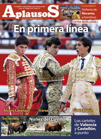APLAUSOS llega esta semana a los kioskos con el I Extra de Novilleros de la temporada. La portada del número la protagonizan Ginés Marín, Varea y Álvaro Lorenzo, que en páginas interiores analizan y explican cómo han sido sus respectivas campañas. “No me obsesiona tanto el cortar orejas como el ser cada día mejor torero. No se debe buscar el triunfo por el triunfo”, afirma Ginés Marín, quien añade: “Antes de la alternativa iré a Vistalegre, Olivenza, Valencia,”ˆSevilla y Madrid, donde me presentaré y despediré de novillero. No puedo descuidarme”.