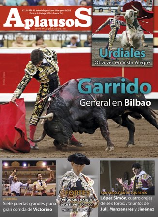 José Garrido protagoniza la portada del número 2.031 de APLAUSOS tras su triunfo en las Corridas Generales de Bilbao donde salió a hombros y cuajó dos tardes soberbias. El extremeño fue junto a Diego Urdiales -que también salió a hombros de Vista Alegre- el nombre propio de una Semana Grande que se analiza al detalle en páginas interiores. Además de Bilbao, en el nuevo ejemplar se cuenta todo lo sucedido en las ferias de Almería, San Sebastián de los Reyes, Colmenar Viejo, Linares, Cuenca, Madrid”¦