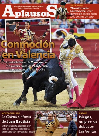 El número 2.078 de APLAUSOS ya está en los quioscos. El semanario taurino destaca en su primera página lo ocurrido en la Feria de Julio de Valencia con las grandes actuaciones de José María Manzanares, que abrió la puerta grande, Paco Ureña, heroico, así como Román.