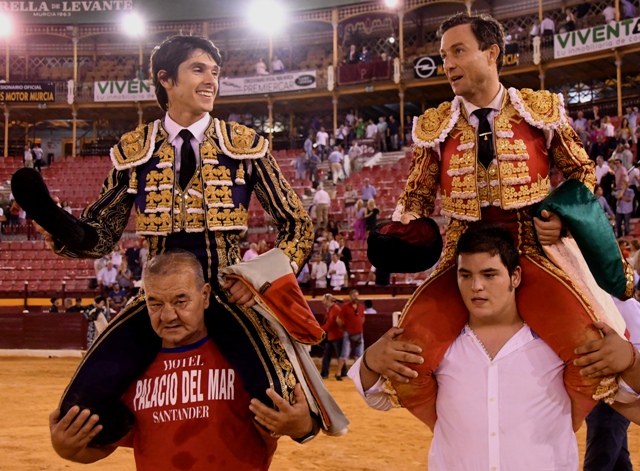 en sus faenas, los cambiados por la espalda en el centro del ruedo quedaron inexistentes. Recibio al primero con lances en el tercio y por galleo para dejar en el caballo. La faena la inicio con ayudados por alto y se encontró con un toro aplomadito que no prestaba emoción. Se vieron un par de tandas por el piton derecho pero a partir de ahi el toro se le vino abajo. No hubo posibilidades. Estocada algo tendida y generosa ovacion. En el cuarto, un toro falto de transmisión, hizo el frances un esfuerzo intentando lo imposible, el toro se puso complicado y defendiendose. Mató de estocada y cortó una oreja, premio a la voluntad y el esfuerzo. El sexto pasó inedito el recibo. La faena de muleta la inicio con estatuarios muy ajustados cerrado en tablas. Tan solo se pudo ver dos tandas muy ligadas por el piton derecho al comienzo, fue lo único que se dejo el Parlade, a partir de ahi, el toro se vino abajo y Castella porfio en la corta distancia ante un toro que se puso complicado y soltaba gañafones. Estocada en la suerte contraria y dos descabellos. Empezaron palmitas que fueron contagiando a la generosa afición murciana y el palco saco pañuelo blanco. Oreja generosa.
