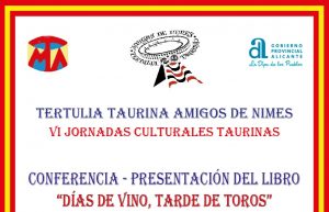 ALICANTE. Lunes, 6 de mayo de 2019. REDACCIÓN.- La Tertulia Taurina »Amigos de Nimes», presidida por nuestro compañero José Maria Jericó, dentro del programa VI Jornadas Culturales Taurinas, celebrará la conferencia-presentación del libro »Días de Vino, Tardes de Toros», a cargo de su autor José Luis Barrachina Susarte -Profesor para Mayores en la Sede Universitaria de Villena y colaborador del Diario Información. La presentación correrá a cargo de Jorge Villar -Licenciado en Filología Hispánica y Periodista Taurino-.