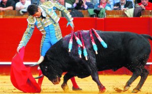 José María Manzanares en un derechazo a ‘Arrojado’ en la tarde del sábado en Sevilla, antes de que se le perdonara la vida. Eduardo Abad