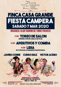 TORRE PACHECO (Murcia). Domingo, 9 febrero 2020 -Prensa-C.T.T.P. – El próximo 7 de Marzo (sábado) organizamos la “II Fiesta Campera” en la Finca Casa Grande – La Herencia, podremos disfrutar de los maestros Javier Conde y Curro Díaz, y el novillero Victor Acebo, con toros de la Ganadería Sancho Dávila.