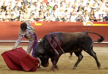 PUBLICADO EN www.APLAUSOS.es POR JORGE CALSALS. Foto. JAVIER ARROYO. La plaza se vino abajo cuando José Tomás piso la arena de la plaza de toros de Valencia. La parroquia se levantó en pie para recibir con una clamorosa y cerrada ovación al diestro de Galapagar, vestido de malva y oro y con detalles de media luna blanca en el bordado. Una nube de periodistas gráficos se agolpó en torno al torero y se trenzó el paseíllo en medio de los aplausos del público. Tras romper el paseo, la gente le obligó a saludar en el tercio. Tuvo nobleza y calidad el primer toro de la tarde, castaño, al que Víctor Puerto recibió con templadas y encajadas verónicas. Tras el segundo puyazo, José Tomás se abrió de capa para quitar por delantales a pies juntos. Quite templado, armonioso y que pese al aire, surgió limpio. Replicó Víctor Puerto con buenas verónicas.