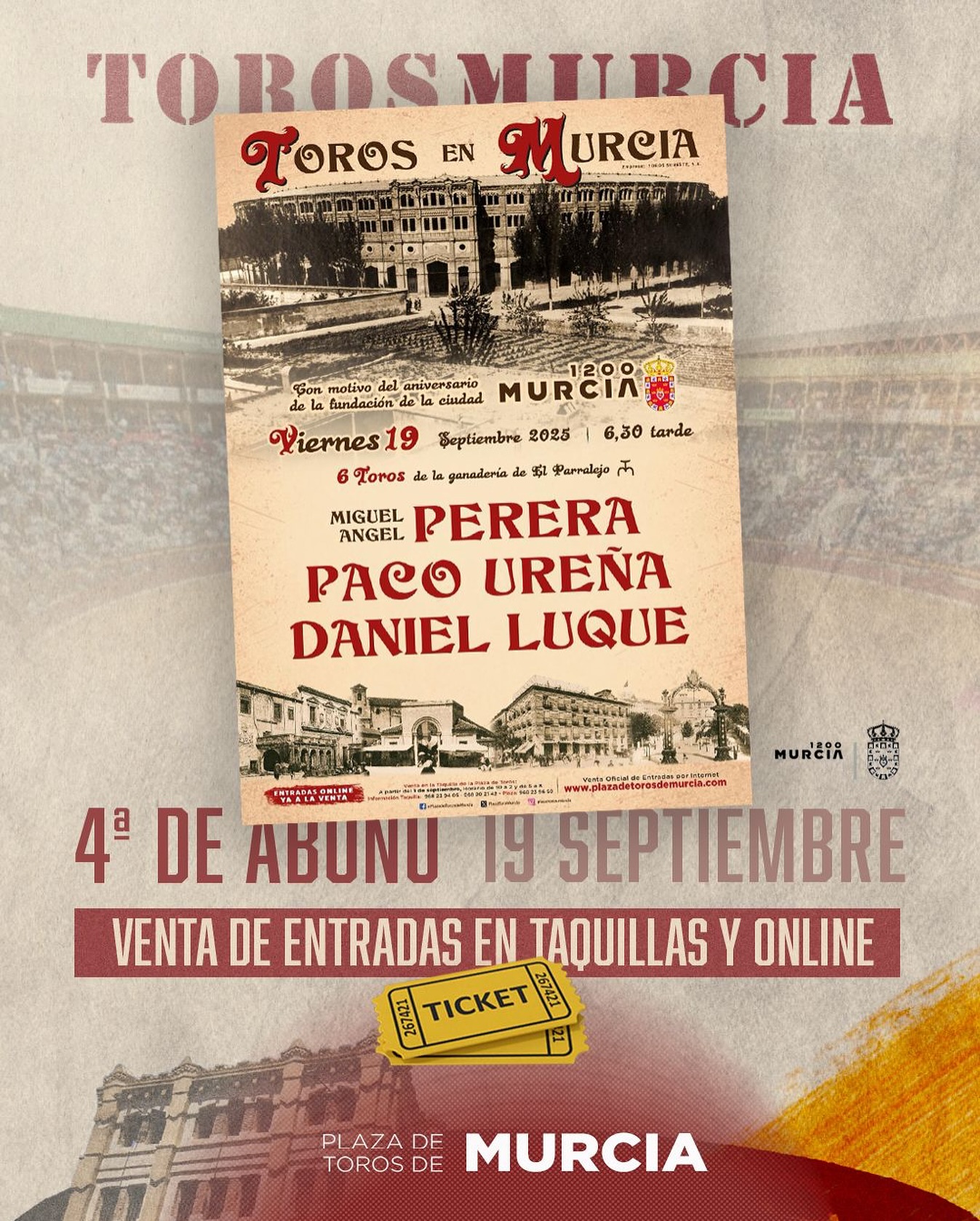 Miguel Ángel Perera, Daniel Luque y Paco Ureña. Toros de El Parralejo. A las 6:30 de la tarde, la Plaza de Toros de Murcia se Viste de Gala.