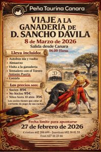 CANARA -Cehegin- (Murcia). Lunes 19 de enero de 2026 – Prensa P.T.C. – La Peña Taurina de Canara informa de la programación de un viaje a la ganadería de D. Sancho Dávila, Dehesa Puertolaca, Santisteban del Puerto (Jaén). En la actualidad, la ganadería D. Sancho Dávila, es de las pocas de la cabaña brava que tiene en pureza la rama de Domecq de Maribel Ybarra.